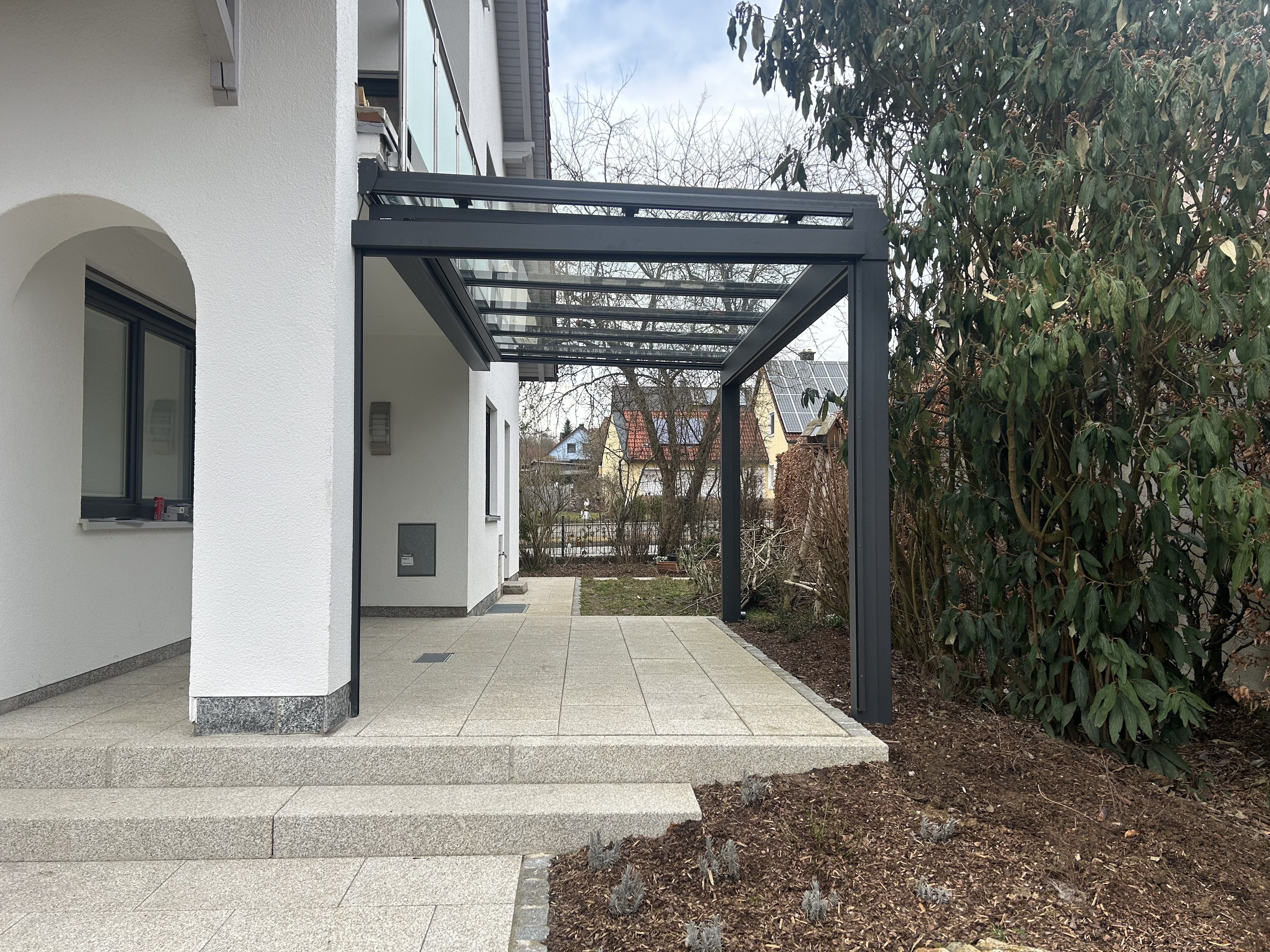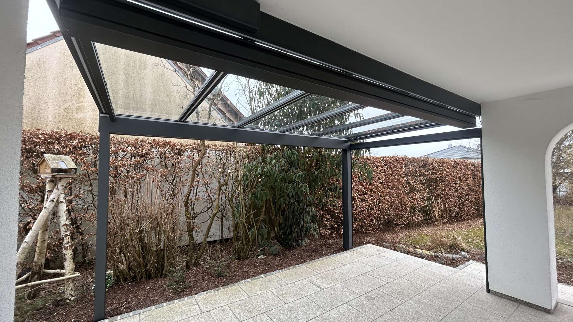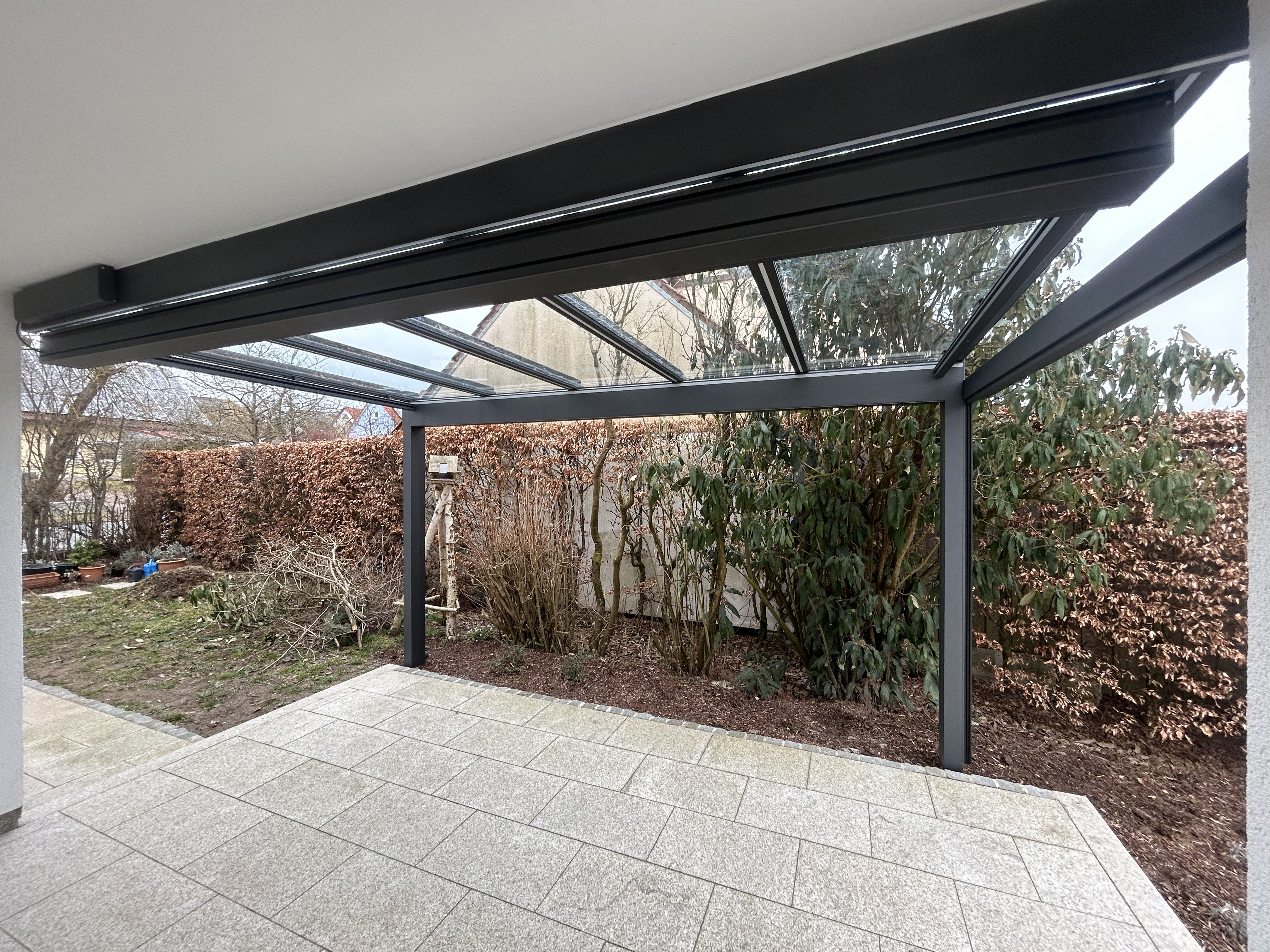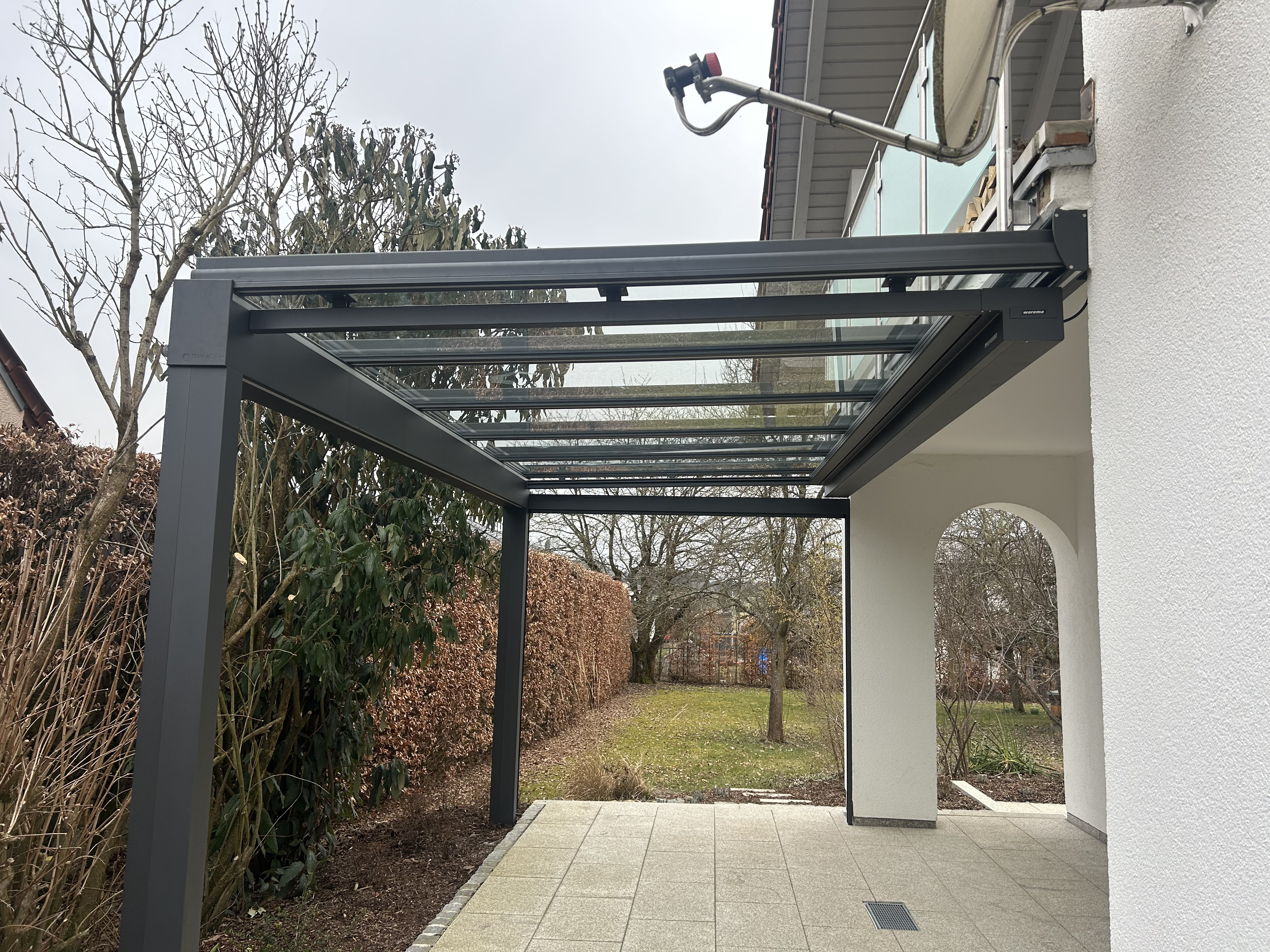 Für dieses Projekt kam das System Avantgarde A300 von Terrasign zum Einsatz, gefertigt aus hochwertigem Aluminium in DB 703 Eisenglimmer. Die robuste Überdachung fügt sich harmonisch in die bestehende Architektur ein und sorgt mit ihrem eleganten Look für eine stilvolle Note. Ergänzt wird das Ganze durch die integrierte Unterglasmarkise unseres Premiumpartners Warema, die zuverlässigen Sonnenschutz bietet, ohne die freie Sicht zu beeinträchtigen.
