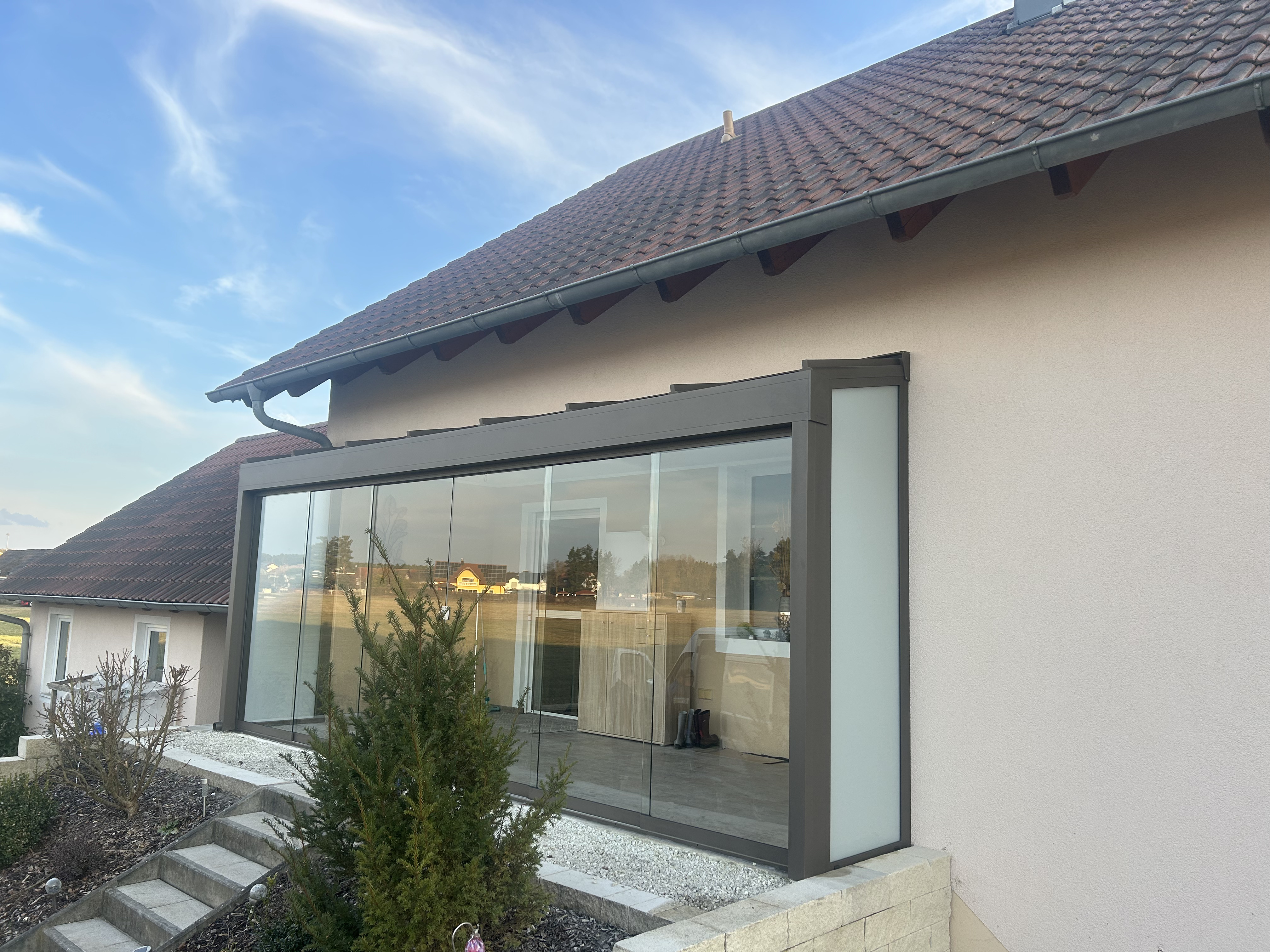 Durch die Kombination von feststehenden Verglasungen und Schiebeelementen entsteht ein wandelbarer Außenbereich, der sich optimal an unterschiedliche Wetterverhältnisse anpasst. Gleichzeitig sorgt das hochwertige Material für Langlebigkeit und ein ansprechendes Erscheinungsbild.