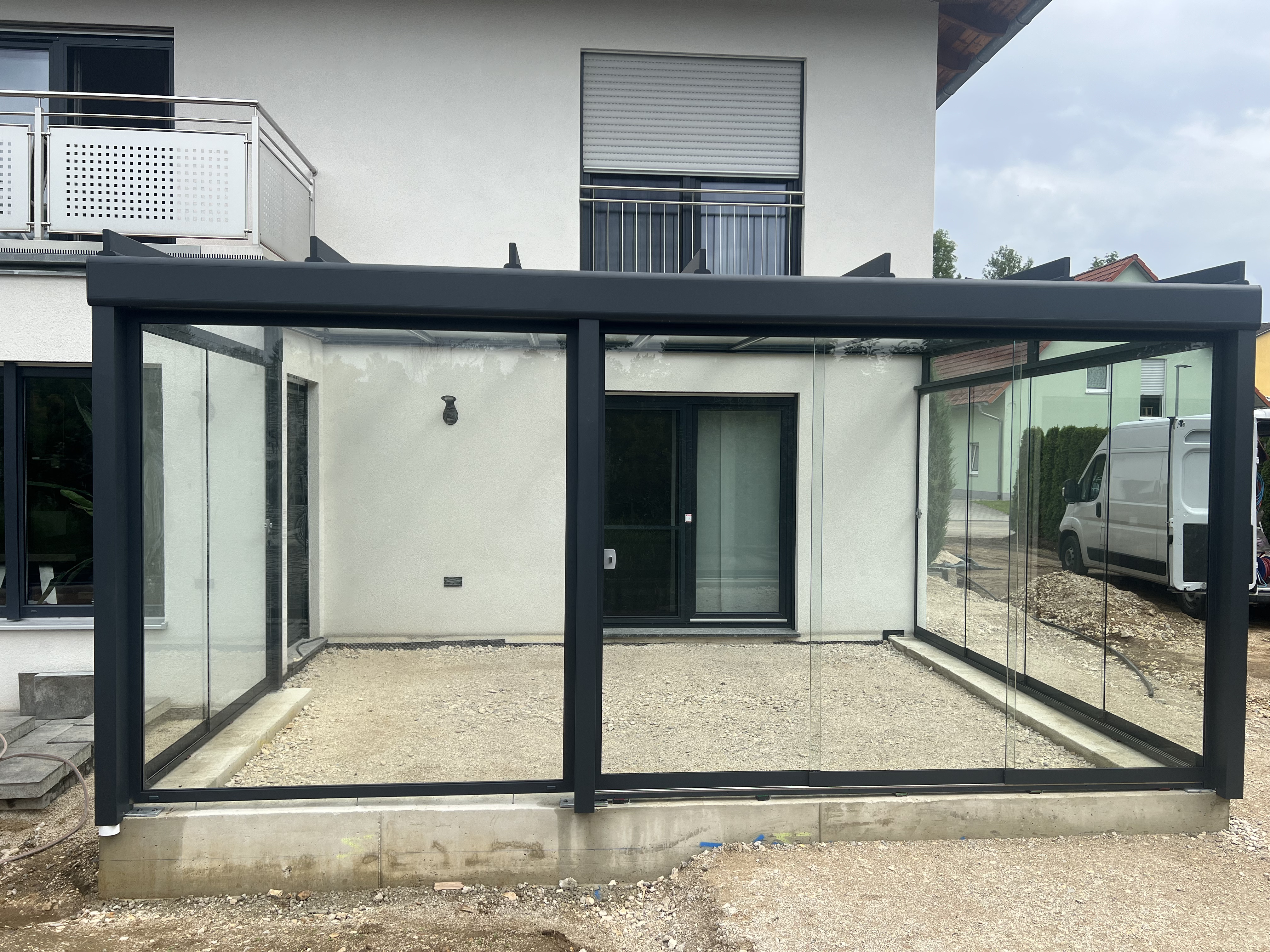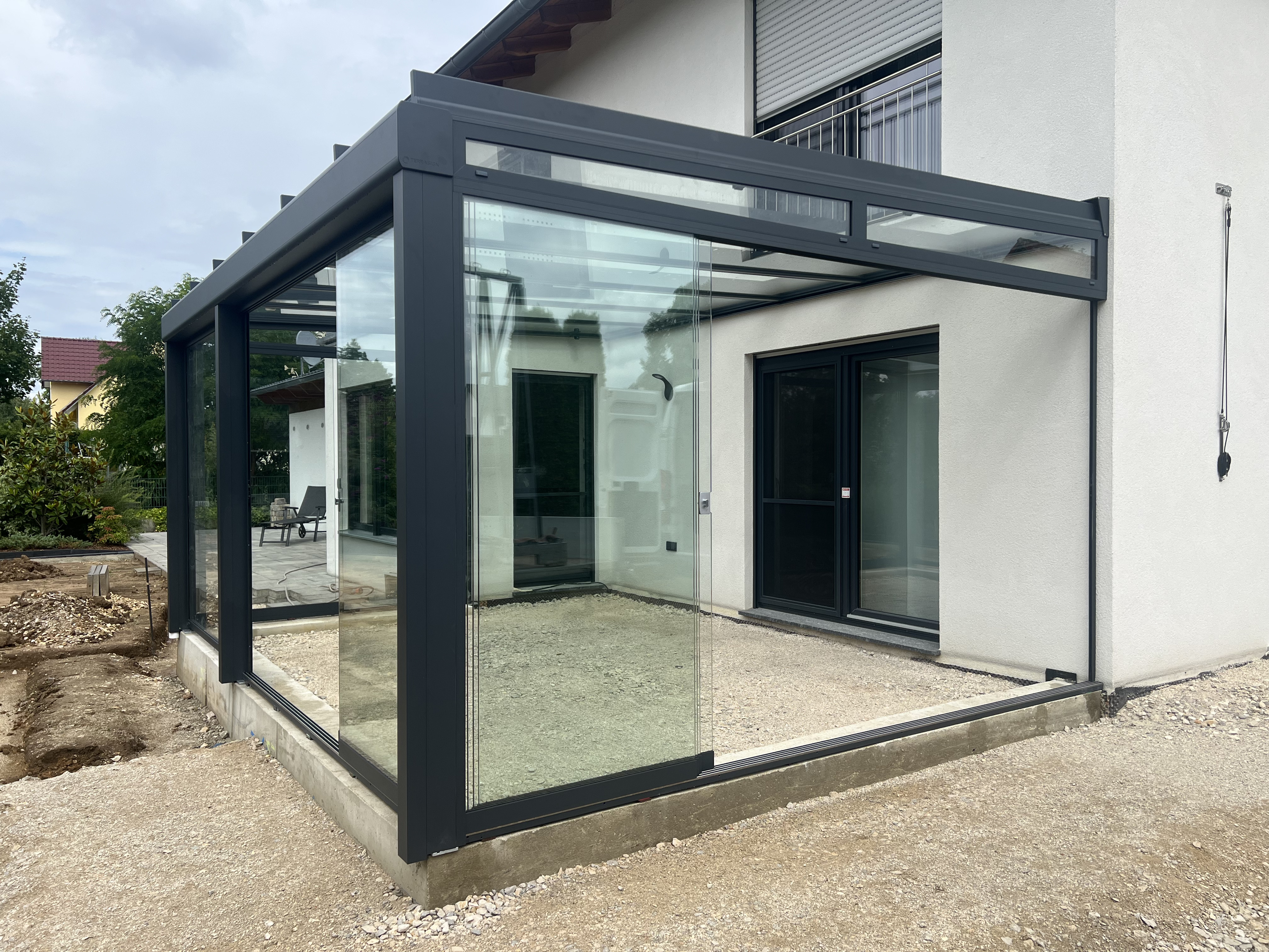 Für unseren privaten Bauherrn in Ensdorf haben wir eine hochwertige Terrassenüberdachung Avantgarde A 600 von Terrasign realisiert – eine robuste, pulverbeschichtete Aluminiumkonstruktion in RAL 7016 Anthrazitgrau, die sich elegant in die Hausarchitektur einfügt.